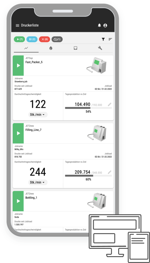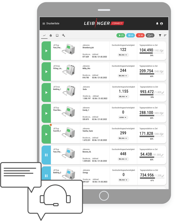 شما دسترسی متمرکز به دادههای پرینتر ارزشمند خود خواهید داشت. آسان برای درک، به راحتی قابل دسترسی است. پلتفرم Leibinger Connect مبتنی بر Cloud secure به شما امکان میدهد عملکرد چاپگرهای مختلف، خطوط تولید یا کل عملیات تولید را به وضوح نمایش دهید – و آن را با استفاده از تصاویر کلیدی معنادار مانند در دسترس بودن و میزان استفاده مقایسه کنید. از طریق URL در هر زمان، هر مکان و با هر دستگاه نهایی. در زبانه های مختلف، میتوانید تمام چاپگرهای متصل به سیستم، از جمله نماهای دقیق دستگاهها و کارهای مربوطه را مشاهده کنید. ارزیابی این دادهها رویکردهای مهمی را برای بهینه سازی فرآیندها برای افزایش کارایی فراهم میکند.